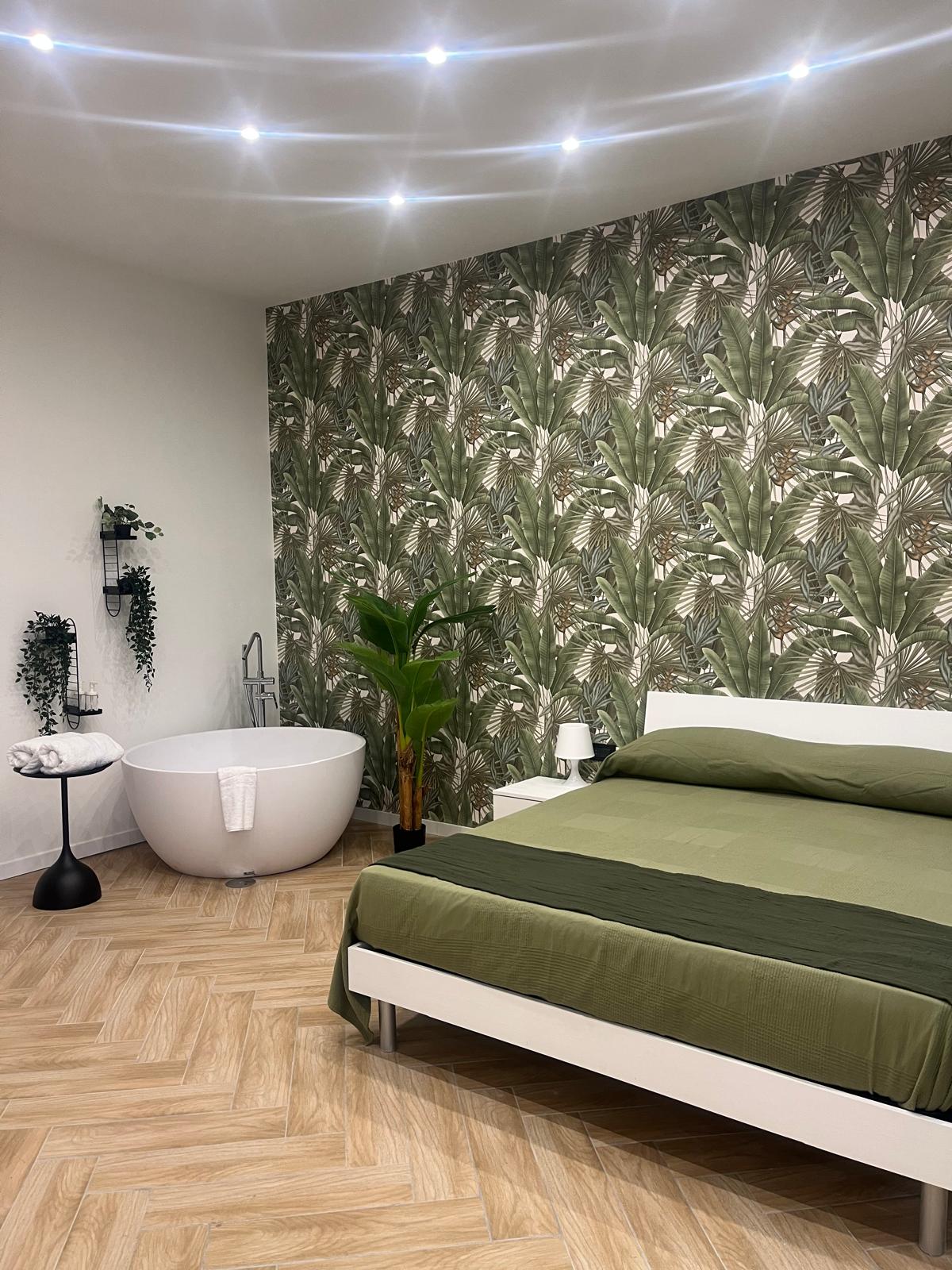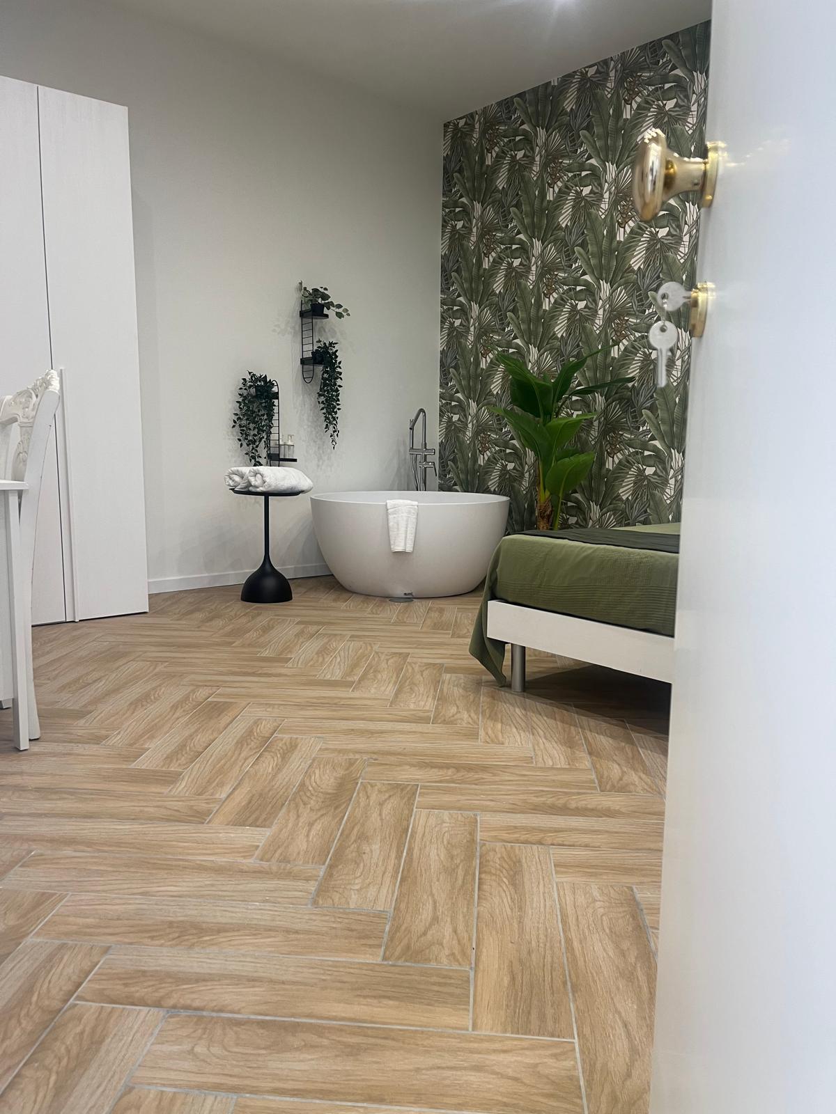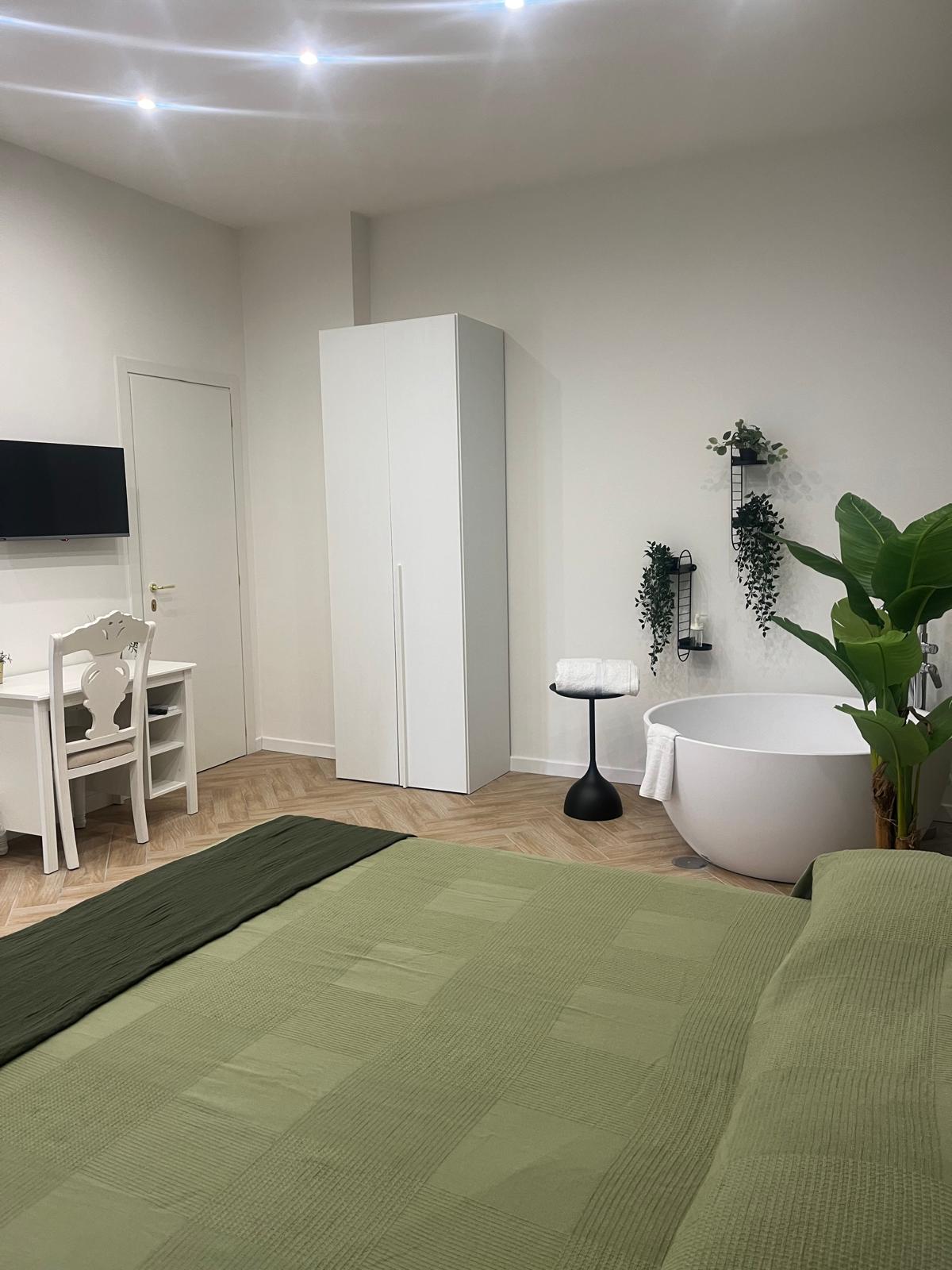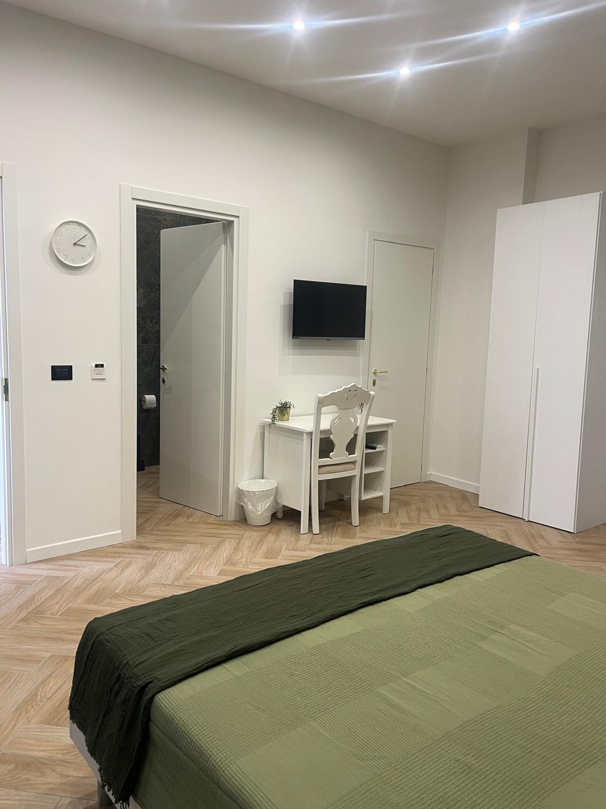Dotata di letto matrimoniale king-size, bagno privato con doccia, connessione Wi-Fi veloce e climatizzazione autonoma. I toni tenui e gli arredi curati creano l’atmosfera ideale per riposarsi dopo una giornata di visite o lavoro.